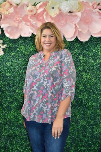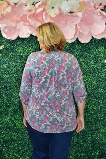 Dear Scarlett Lizzy Top – Juliette | Plus Size Gray Ditzy Floral Blouse, Wrinkle-Free, Sizes XL-3X
