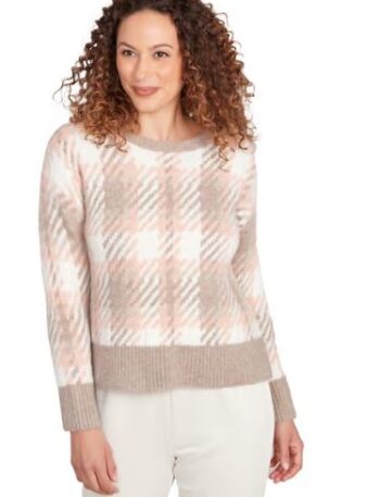 Hadley Neutral Plaid Plus Size Sweater with Subtle Gold Lurex | Cozy Soft Plaid Pullover in Sizes L–3X