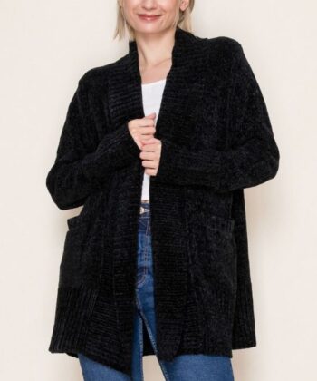Plus Size Black Chenille Cardigan With Pockets | Soft Cozy Knit Sweater | Sizes 1X–3X