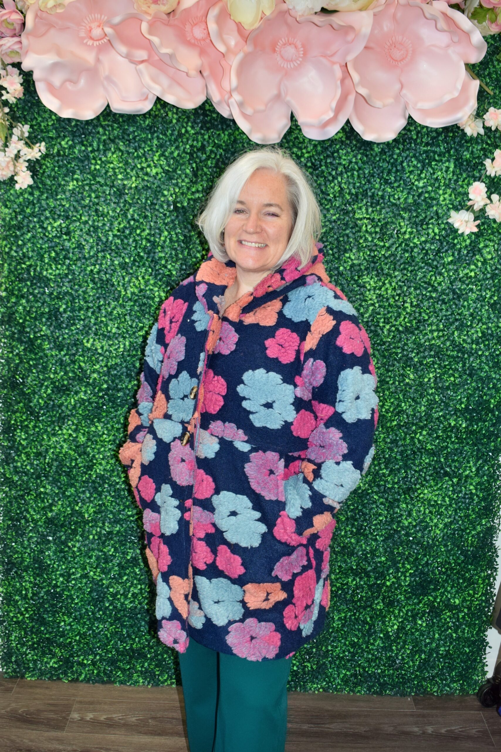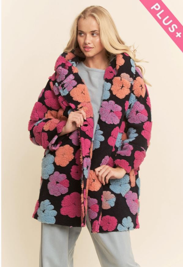 Step into statement-making comfort with The Margo Bouclé Floral Jacket — your new favorite blend of warmth and whimsy. This plush, soft-textured coat features oversized chenille-style floral details in rich shades of fuchsia, coral, sky blue, and lavender, set against a deep black background for eye-catching contrast.