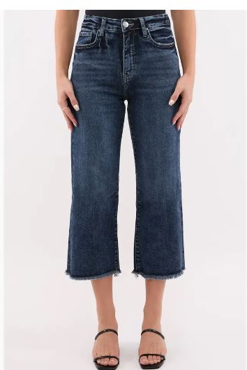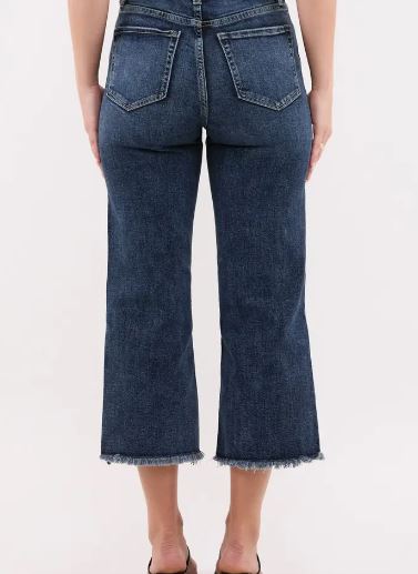 Crafted with a flattering high-rise fit, soft stretch denim, and a chic cropped wide leg, the Chloe offers endless versatility — dress them up with heels or keep it casual with sneakers. The dark wash finish, subtle fading, and frayed hem detail make these jeans a wardrobe essential that transitions seamlessly from day to night.