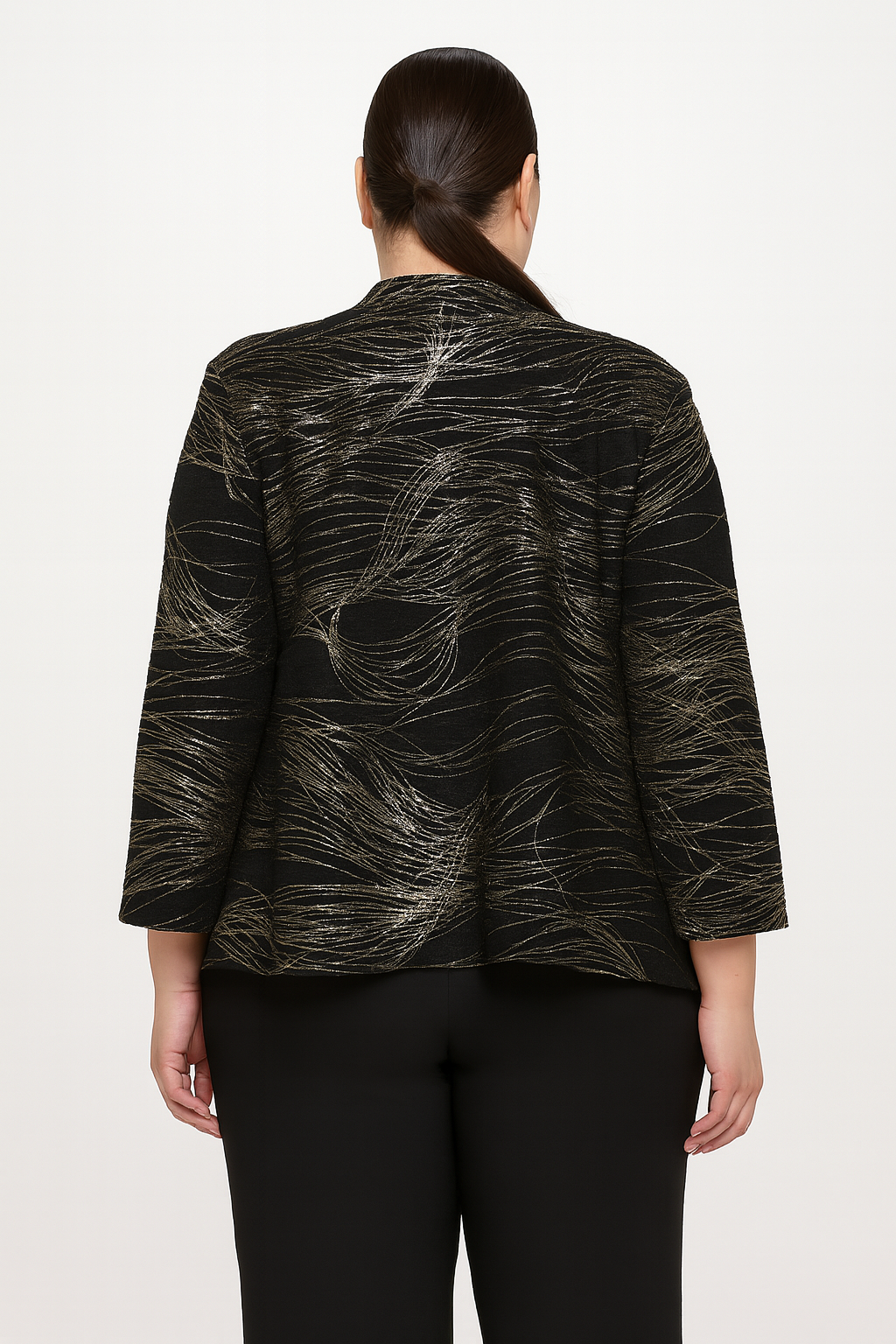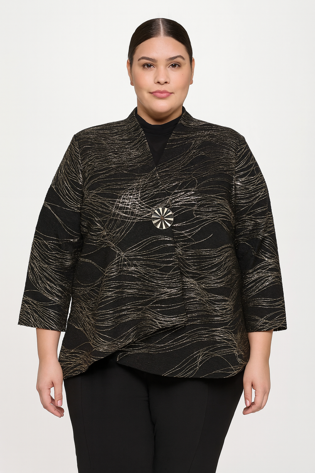 Make a statement without saying a word. The Lila Jacket by Jostar blends timeless sophistication with a touch of modern glamour. This luxurious black jacket features a flowing gold swirl pattern that catches the light with every move, creating an effortlessly elegant look. Designed with a relaxed fit, 3/4 sleeves, and a striking oversized accent button, this piece transitions beautifully from day to night. Pair it with coordinating pants for a polished set or your favorite black trousers for a chic, standalone statement.